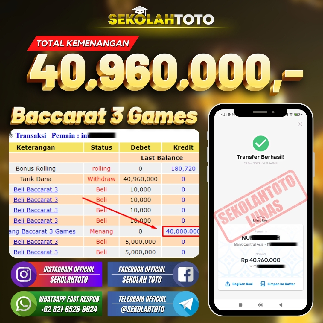 BUKTI JACKPOT LIVE CASINO 3 Januari 2024 Posted by kepsektoto Baccarat 3 Kamis, 28 Desember 2023 RP. 40.960.000,- Selamat Kepada Pemenang. Salam JP, Sekolahtoto ! Updated: 3 Januari 2024 at 23:58 ◀ Prediksi Togel Taiwan Loterry Hari Ini BUKTI JACKPOT PASARAN CAMBODIA ▶