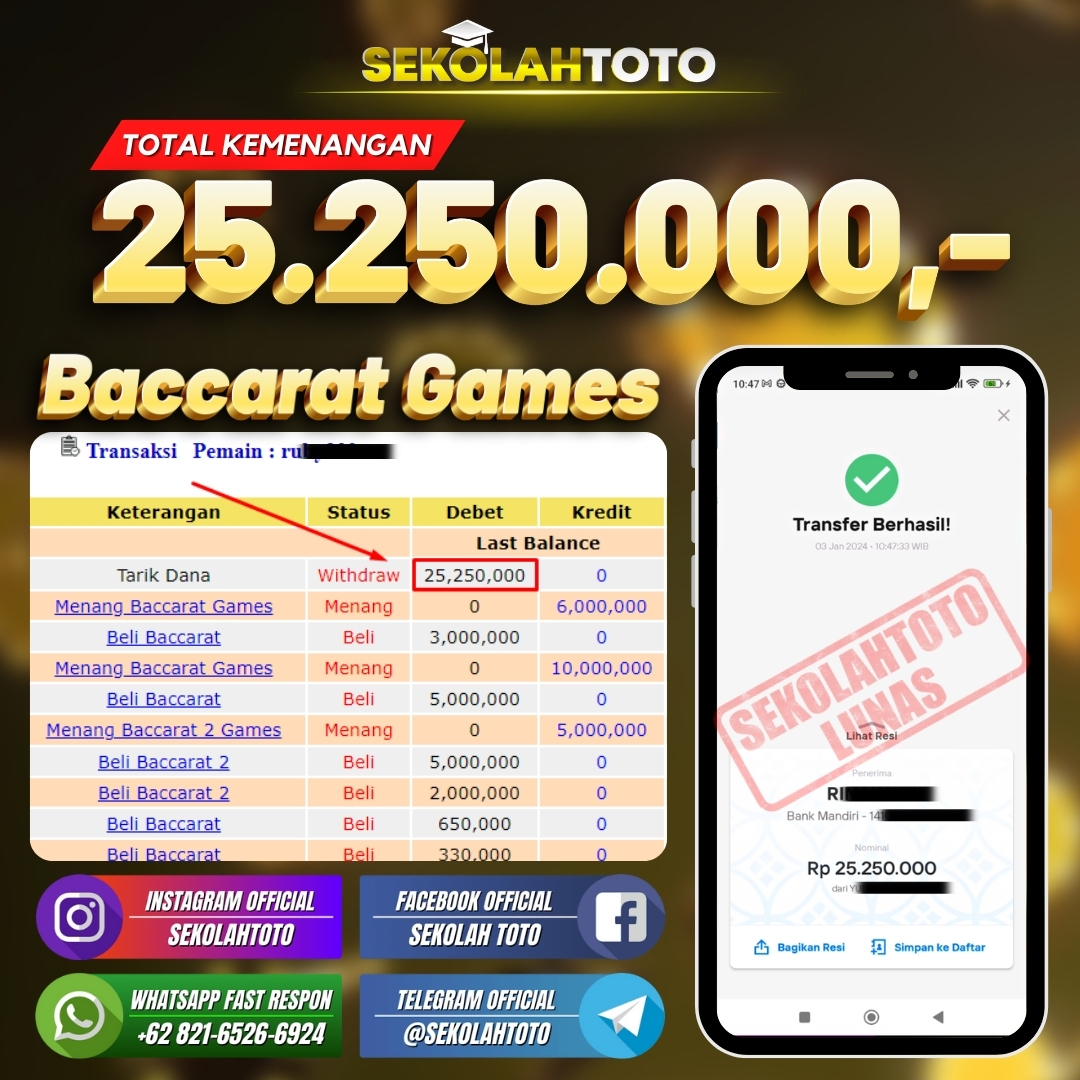 BUKTI JACKPOT LIVE CASINO 7 Januari 2024 Posted by kepsektoto Baccarat Rabu, 03 Januari 2024 RP. 25.250.000,- Selamat Kepada Pemenang. Salam JP, Sekolahtoto ! Updated: 7 Januari 2024 at 21:17 ◀ BUKTI JACKPOT SLOT GAMES BUKTI JACKPOT SLOT GAMES ▶