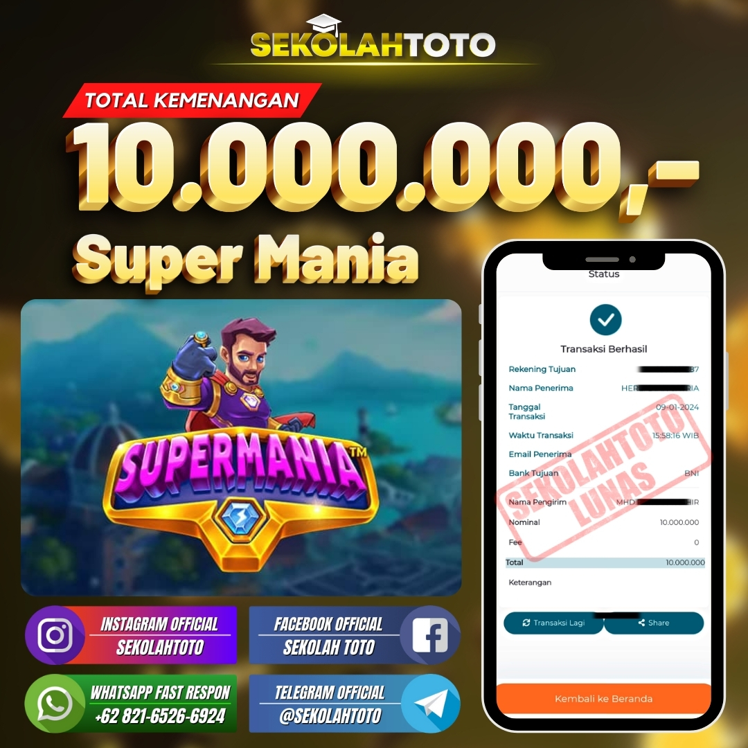 BUKTI JACKPOT SLOT GAMES 12 Januari 2024 Posted by kepsektoto Super Mania Selasa, 09 Januari 2024 RP. 10.000.000,- Selamat Kepada Pemenang. Salam JP, Sekolahtoto ! Updated: 12 Januari 2024 at 23:34 ◀ BUKTI JACKPOT LIVE CASINO BUKTI JACKPOT LIVE CASINO ▶