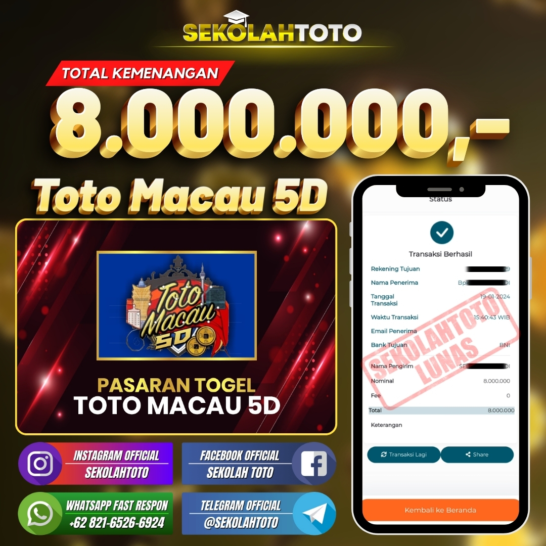 BUKTI JACKPOT PASARAN TOTO MACAU 5D 24 Januari 2024 Posted by kepsektoto Toto Macau 5D Jumat, 19 Januari 2024 RP. 8.000.000,- Selamat Kepada Pemenang. Salam JP, Sekolahtoto ! Updated: 24 Januari 2024 at 17:33 ◀ Prediksi Togel Taiwan Loterry Hari Ini BUKTI JACKPOT LIVE CASINO ▶