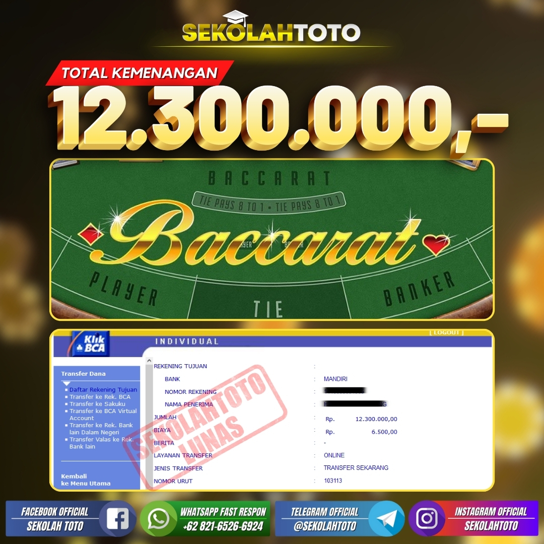 BUKTI JACKPOT LIVE CASINO 15 Maret 2024 Posted by kepsektoto Baccarat 2 Games Selasa, 12 Maret 2024 RP. 12.300.000,- Selamat Kepada Pemenang. Salam JP, Sekolahtoto ! Updated: 15 Maret 2024 at 23:45 ◀ BUKTI JACKPOT PASARAN CAMBODIA BUKTI JACKPOT PASARAN SINGAPORE ▶