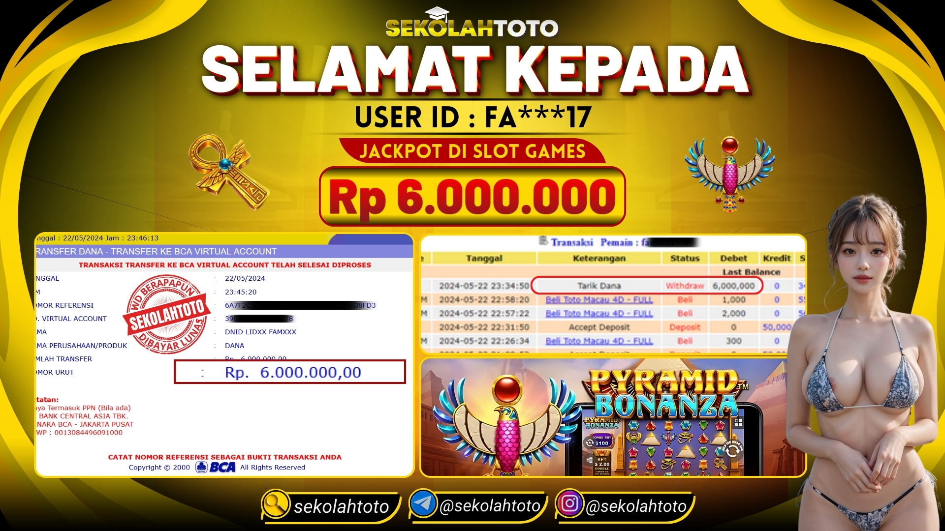 BUKTI JACKPOT SLOT GAMES 24 Mei 2024 Posted by kepsektoto Pyramid Bonanza Rabu, 22 Mei 2024 RP. 6.000.000,- Selamat Kepada Pemenang. Salam JP, Sekolahtoto ! Updated: 24 Mei 2024 at 23:34 ◀ BUKTI JACKPOT SLOT GAMES BUKTI JACKPOT LIVE CASINO ▶