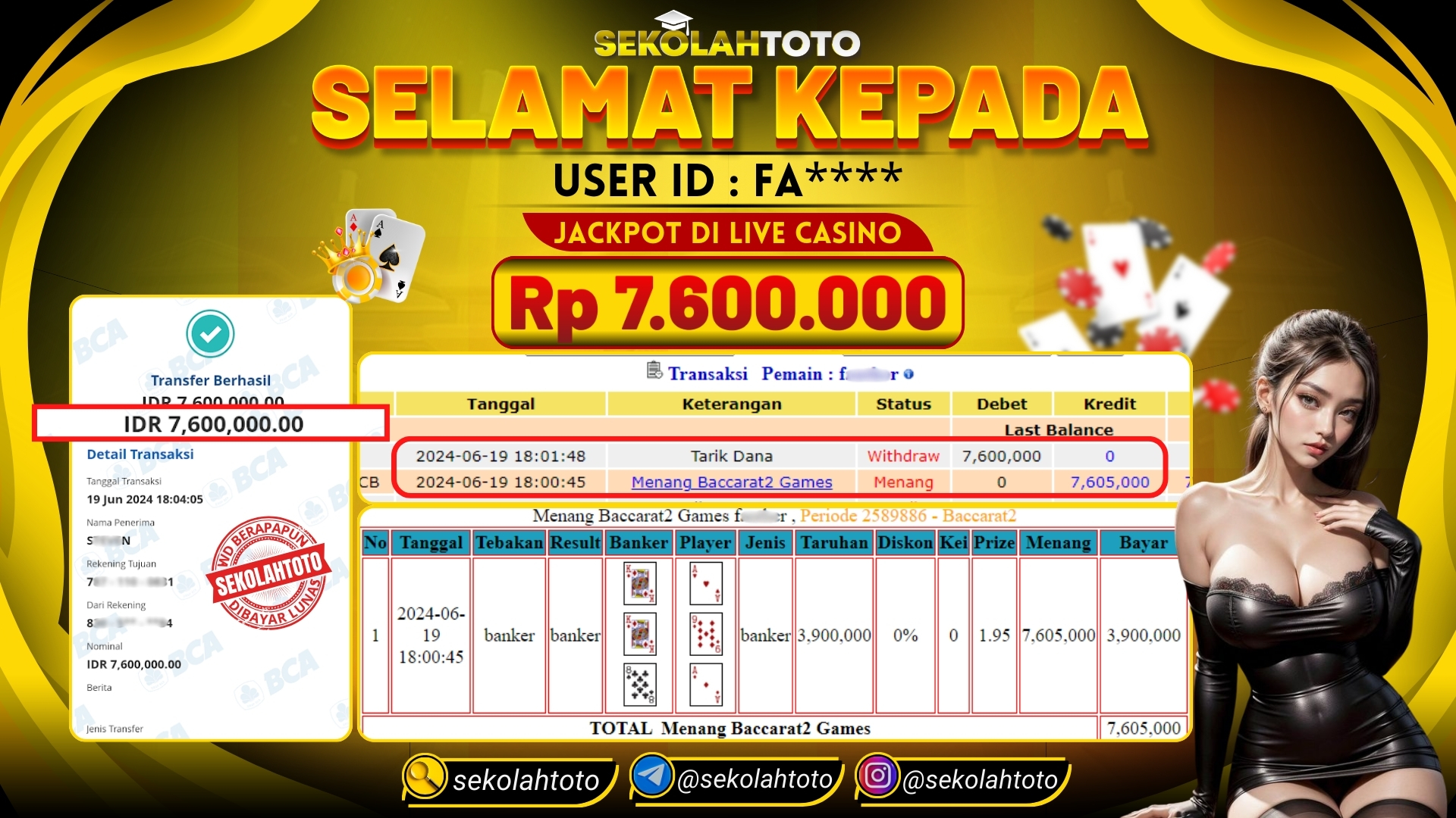 BUKTI JACKPOT LIVE CASINO 21 Juni 2024 Posted by kepsektoto Baccarat 2 Games Rabu, 19 Juni 2024 RP. 7.600.000,- Selamat Kepada Pemenang. Salam JP, Sekolahtoto ! Updated: 21 Juni 2024 at 22:35 ◀ BUKTI JACKPOT PASARAN TOTO MACAO BUKTI JACKPOT SLOT GAMES ▶