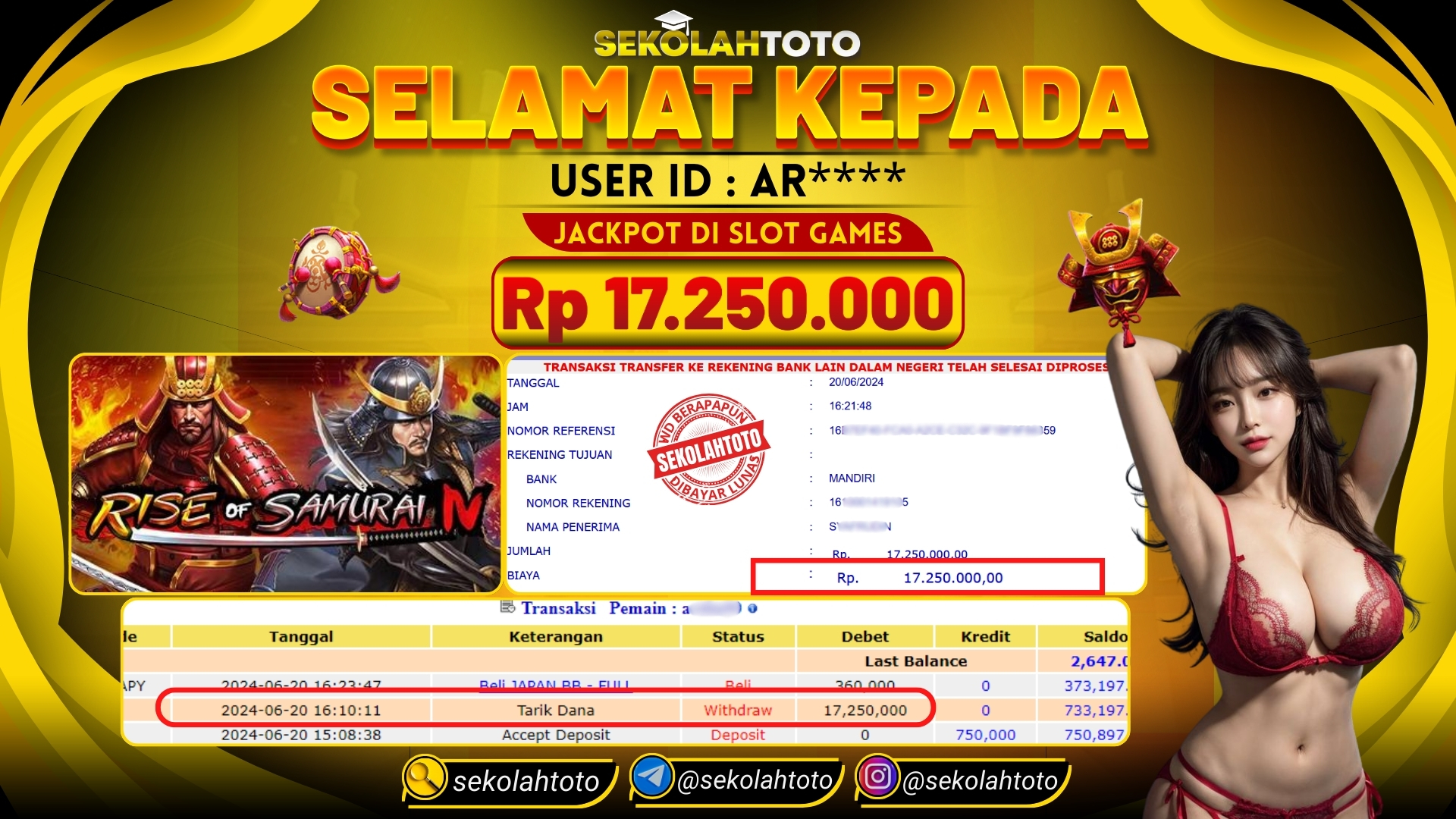 BUKTI JACKPOT SLOT GAMES 21 Juni 2024 Posted by kepsektoto Rise of Samurai Kamis, 20 Juni 2024 RP. 17.250.000,- Selamat Kepada Pemenang. Salam JP, Sekolahtoto ! Updated: 21 Juni 2024 at 22:41 ◀ BUKTI JACKPOT SLOT GAMES BUKTI JACKPOT SLOT GAMES ▶