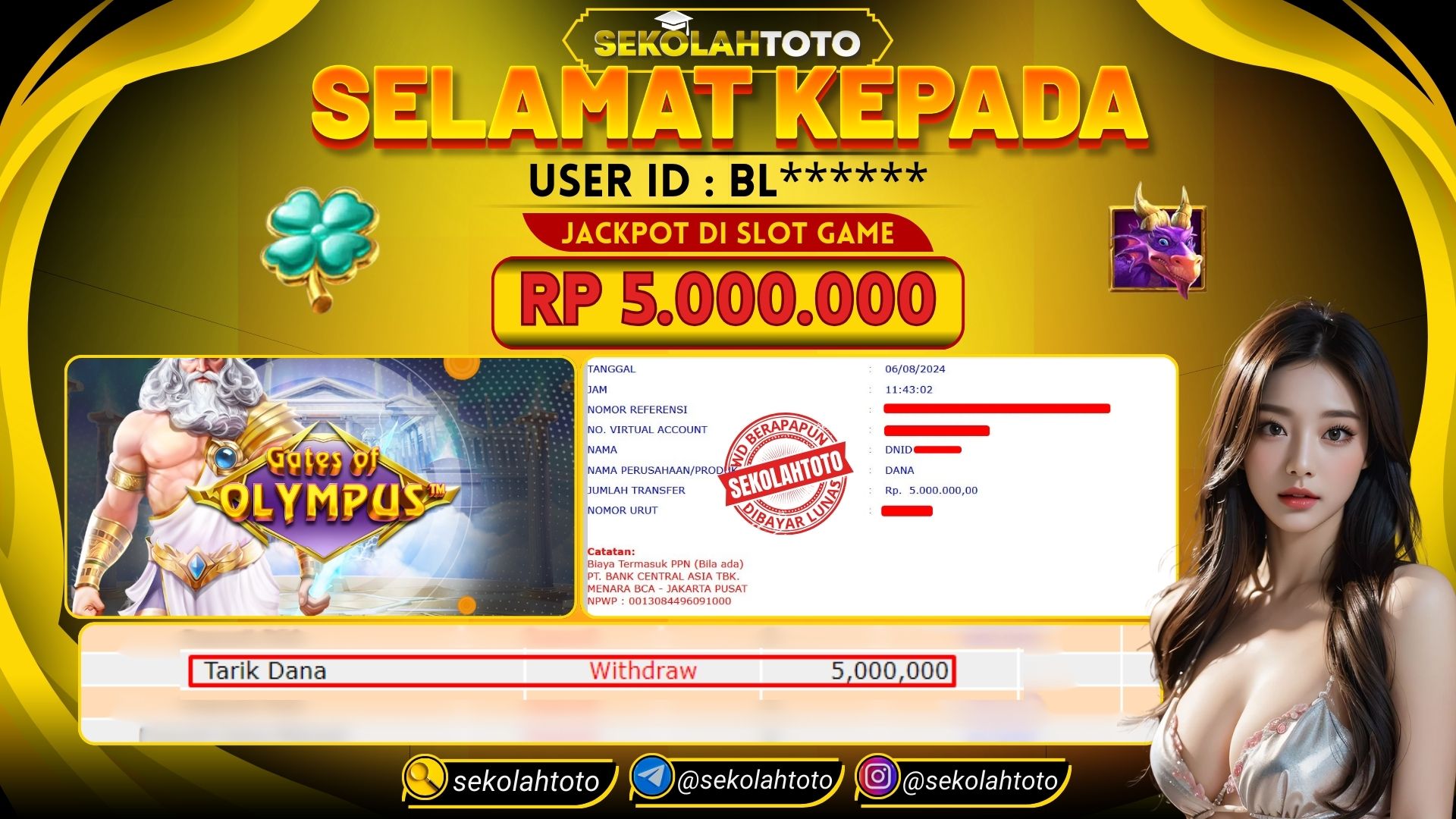 BUKTI PEMBAYARAN JACKPOT SLOT 6 Agustus 2024 Posted by kepsektoto PRAGMATIC PLAY SELASA, 06 Agustus 2024 RP. 5.000.000,- Selamat Kepada Pemenang. Salam JP, Sekolahtoto ! Updated: 6 Agustus 2024 at 16:09 ◀ BUKTI PEMBAYARAN JACKPOT TOGEL BUKTI PEMBAYARAN JACKPOT SLOT ▶