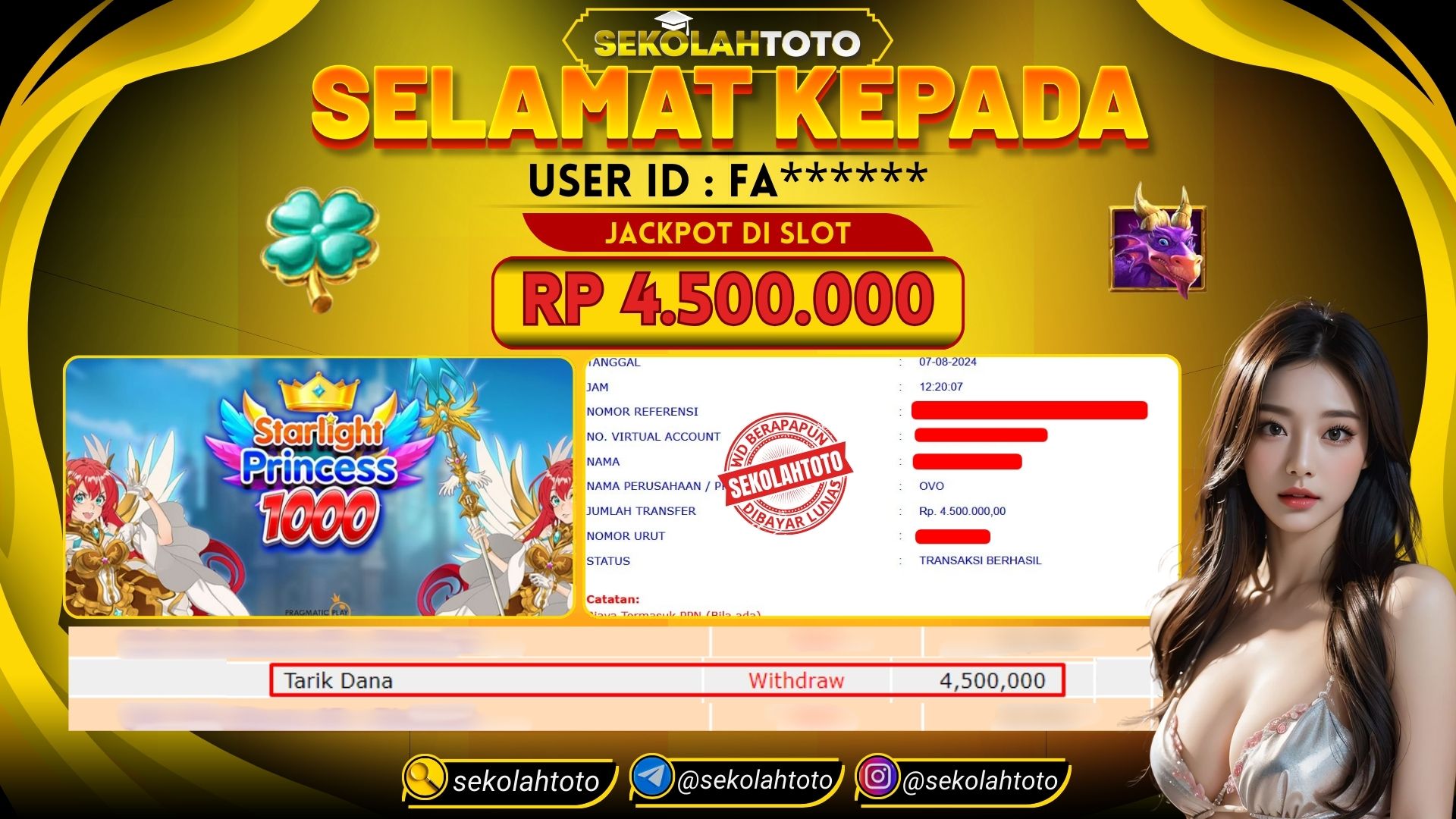 BUKTI PEMBAYARAN JACKPOT SLOT 7 Agustus 2024 Posted by kepsektoto STARLIGHT PRINCESS Rabu, 07 Agustus 2024 RP. 4,500,000,- Selamat Kepada Pemenang. Salam JP, Sekolahtoto ! Updated: 7 Agustus 2024 at 13:25 ◀ BUKTI PEMBAYARAN JACKPOT SLOT BUKTI PEMBAYARAN JACKPOT LIVE GAME ▶