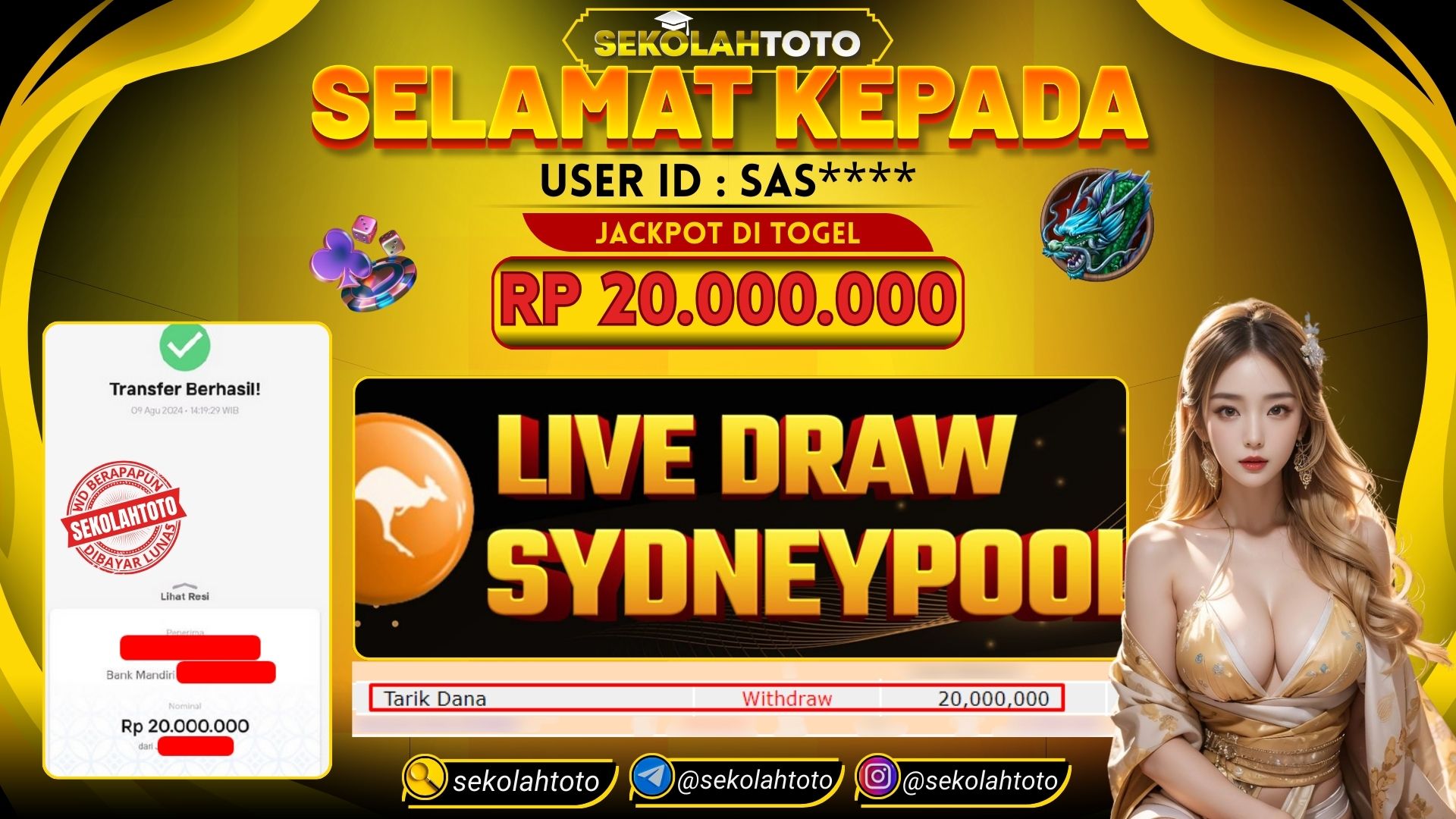 BUKTI PEMBAYARAN JACKPOT TOGEL 9 Agustus 2024 Posted by kepsektoto SYDNEY POOLS JUMAT, 09 Agustus 2024 RP. 20.000.000,- Selamat Kepada Pemenang. Salam JP, Sekolahtoto !. Updated: 9 Agustus 2024 at 14:56 ◀ BUKTI PEMBAYARAN JACKPOT SLOT BUKTI PEMBAYARAN JACKPOT SLOT ▶