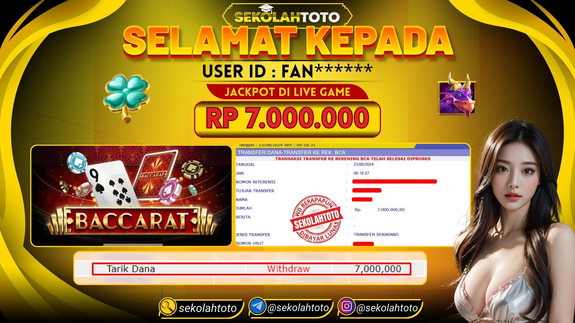 BUKTI PEMBAYARAN JACKPOT LIVE GAME 23 Agustus 2024 Posted by kepsektoto LIVE GAME BACCARAT JUMAT, 23 Agustus 2024 RP. 7,000,000,- Selamat Kepada Pemenang. Salam JP, Sekolahtoto ! Updated: 23 Agustus 2024 at 07:34 ◀ BUKTI PEMBAYARAN JACKPOT TOGEL BUKTI PEMBAYARAN JACKPOT LIVE GAME ▶