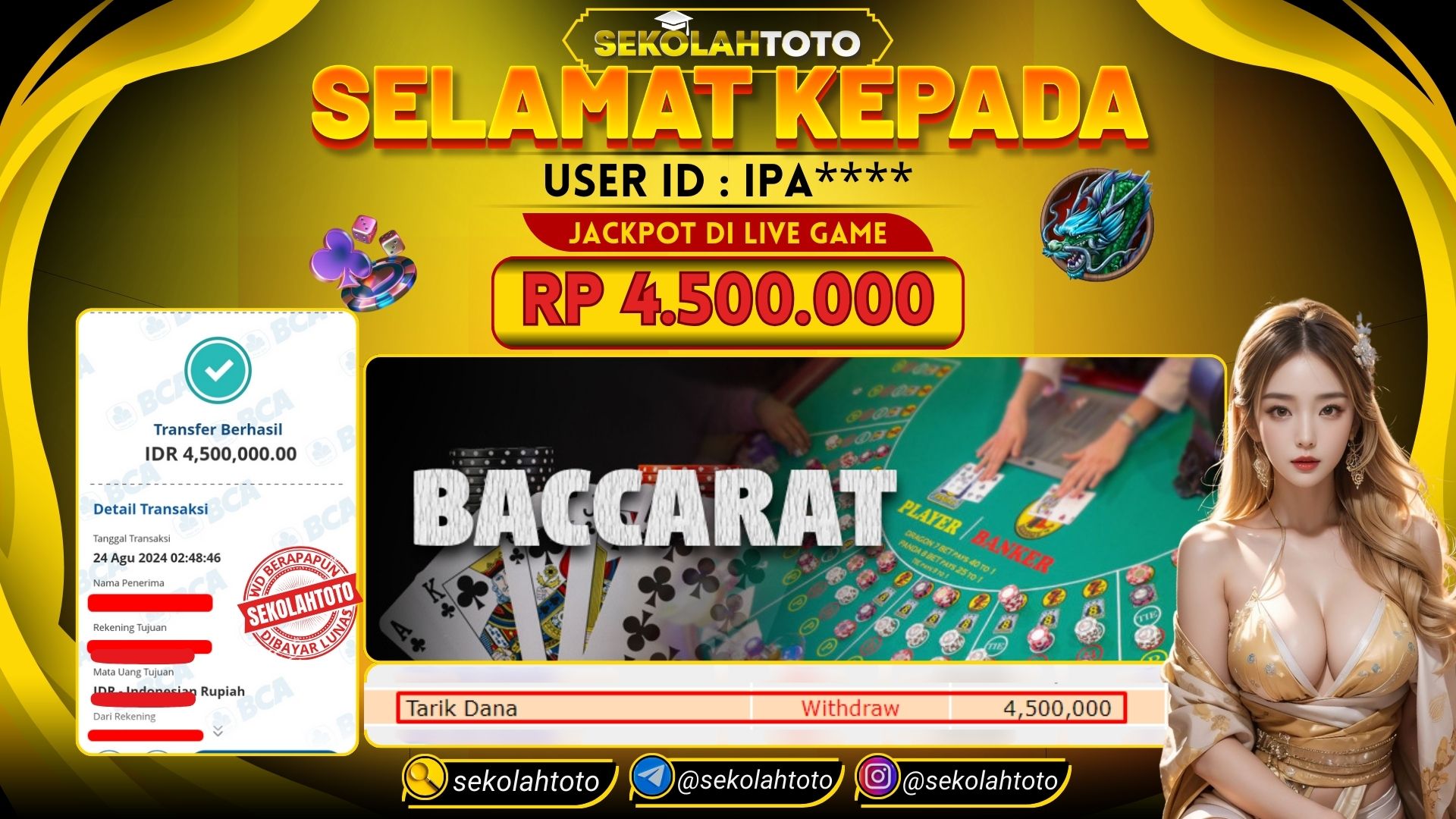 BUKTI PEMBAYARAN JACKPOT LIVE GAME 24 Agustus 2024 Posted by kepsektoto BACCARAT SABTU, 24 Agustus 2024 RP. 4,500,000,- Selamat Kepada Pemenang. Salam JP, Sekolahtoto ! Updated: 24 Agustus 2024 at 03:04 ◀ Prediksi Togel Toto Macau Hari Ini BUKTI PEMBAYARAN JACKPOT LIVE GAME ▶