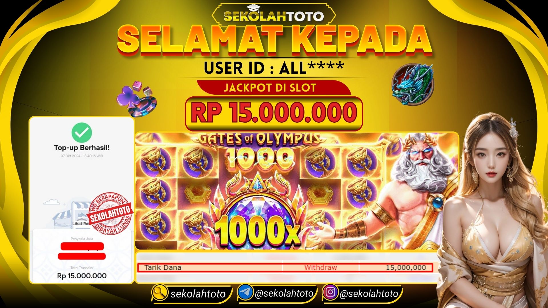 BUKTI PEMBAYARAN JACKPOT SLOT 7 Oktober 2024 Posted by kepsektoto GATES OF OLYMPUS SENIN, 7 OKTOBER 2024 RP. 15,000,000,- Selamat Kepada Pemenang. Salam JP, Sekolahtoto ! Updated: 7 Oktober 2024 at 15:50 ◀ Prediksi Togel Toto Macau Hari Ini Prediksi Togel Bullseye Pools Hari Ini ▶
