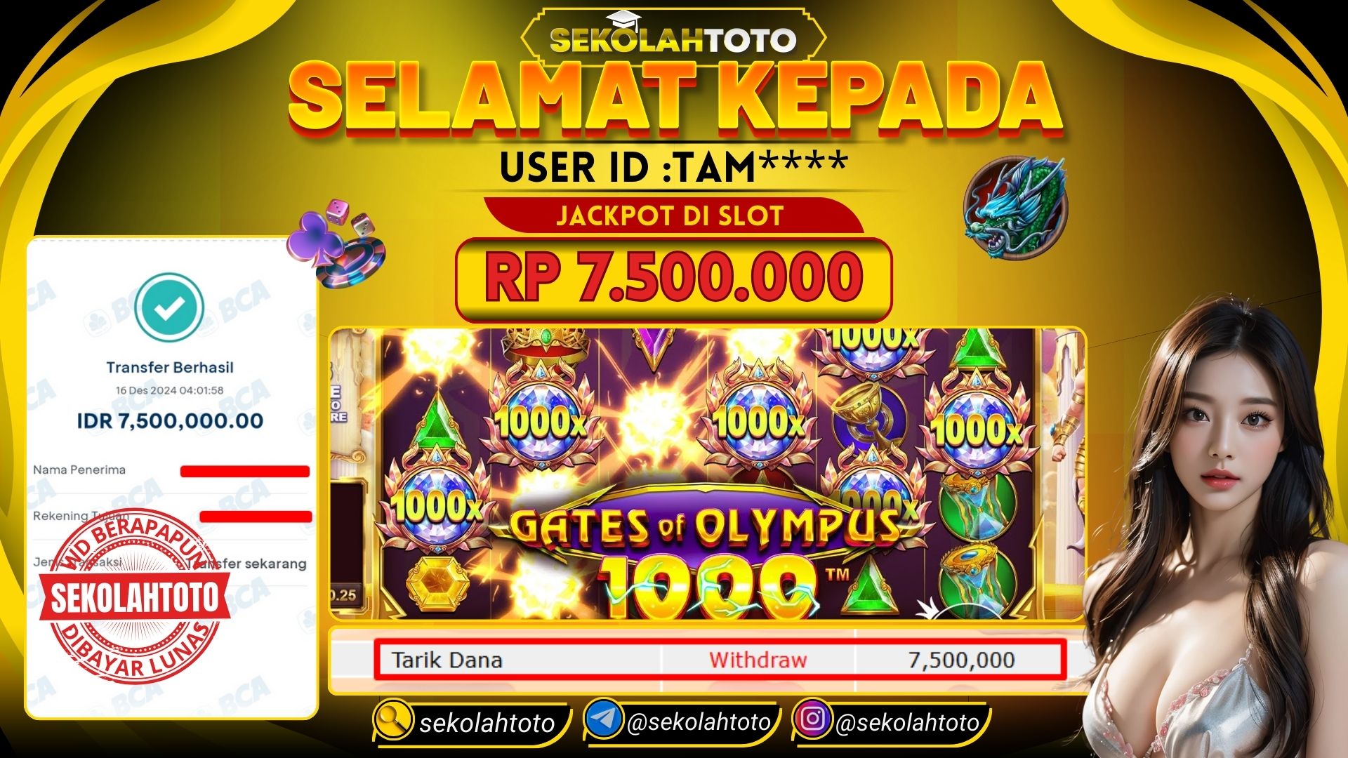 BUKTI PEMBAYARAN JACKPOT PRAGMATIC PLAY 16 Desember 2024 Posted by kepsektoto GATES OF OLYMPUS 1000X SENIN , 16 DESEMBER 2024 RP. 7,500,000,- Selamat Kepada Pemenang. Salam JP, Sekolahtoto ! Updated: 16 Desember 2024 at 06:15 ◀ Prediksi Togel Toto Macau Hari Ini BUKTI PEMBAYARAN JACKPOT TOGEL ▶