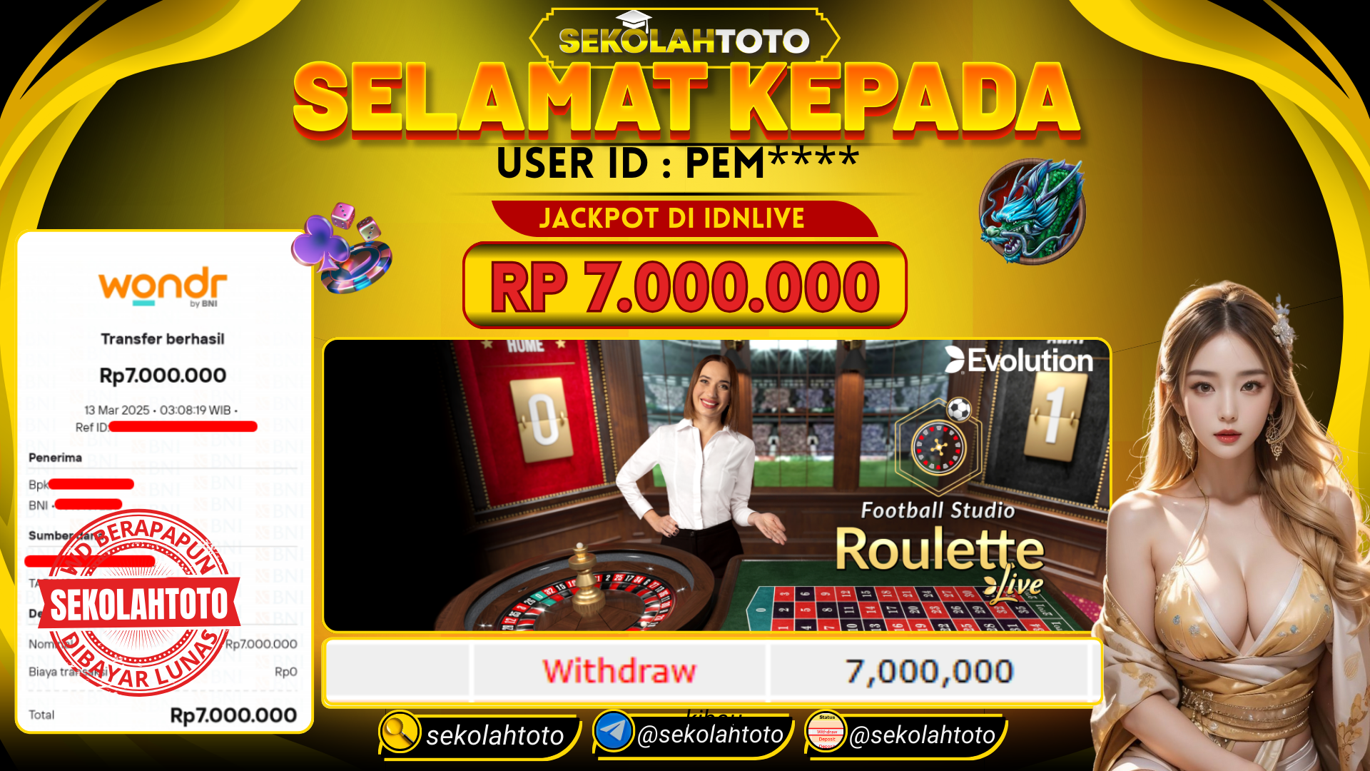 BUKTI PEMBAYARAN JACKPOT IDNLIVE 13 Maret 2025 Posted by kepsektoto IDNLIVE CASINO ROULETTE KAMIS , 13 MARET 2025 RP. 7,000,000,- Selamat Kepada Pemenang. Salam JP, Sekolahto Updated: 13 Maret 2025 at 03:38 ◀ Prediksi Togel Toto Macau Hari Ini BUKTI PEMBAYAR JACKPOT PRAGMATIC PLAY ▶