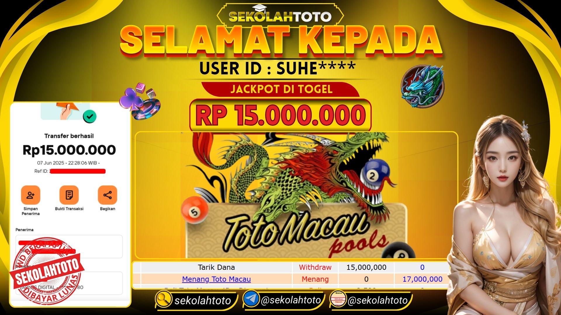 BUKTI PEMBAYARAN JACKPOT TOGEL 7 Juni 2025 Posted by kepsektoto TOTO MACAU SABTU, 7 JUNI 2025 RP 15,000,000,- Selamat Kepada Pemenang. Salam JP Updated: 7 Juni 2025 at 22:52 ◀ BUKTI PEMBAYARAN JACKPOT PRAGMATIC PLAY Prediksi Togel Bullseye Pools Hari Ini ▶