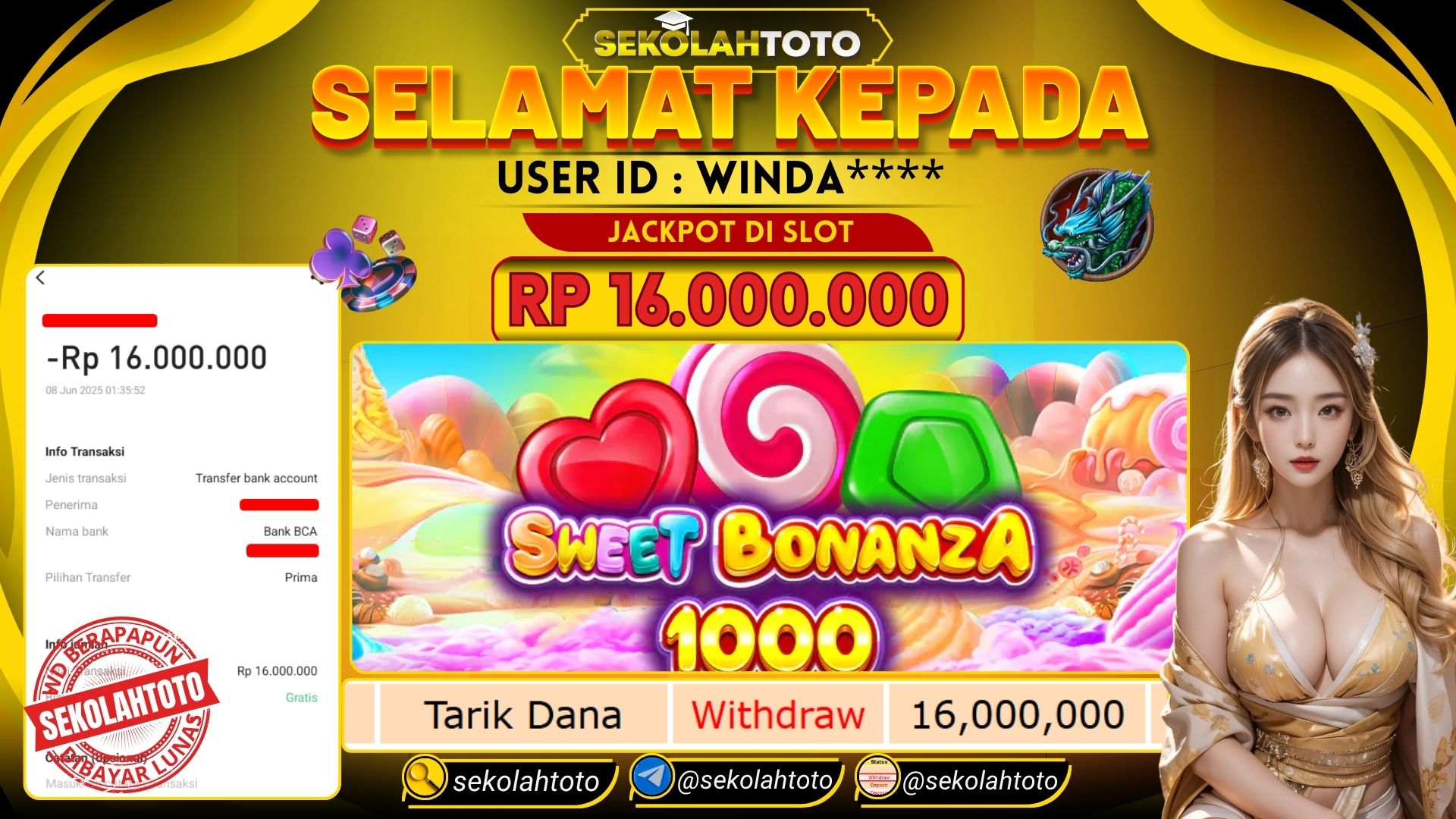 BUKTI PEMBAYARAN JACKPOT PRAGMATIC PLAY 8 Juni 2025 Posted by kepsektoto SWEET BONANZA 1000 MINGGU, 8 JUNI 2025 RP 16,000,000,- Selamat Kepada Pemenang. Salam JP Updated: 8 Juni 2025 at 01:43 ◀ Prediksi Togel Toto Macau Hari Ini Prediksi Togel Bullseye Pools Hari Ini ▶