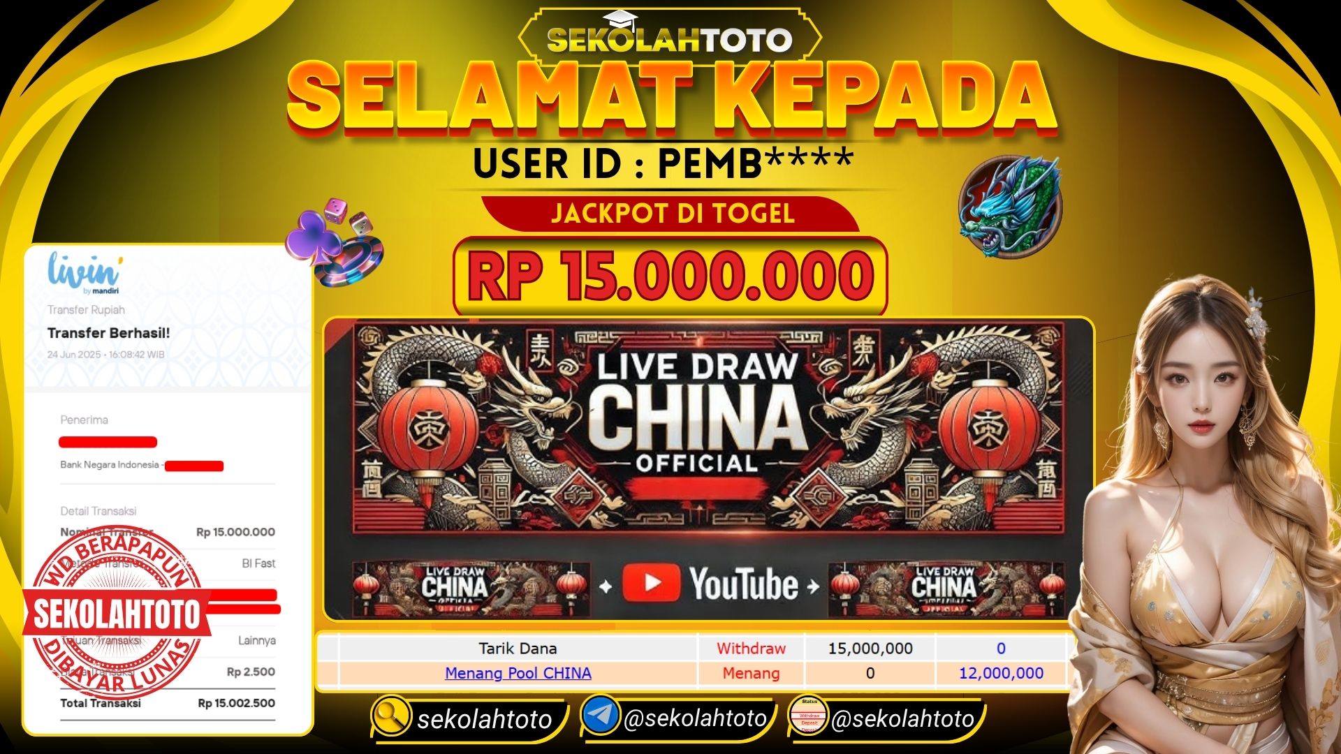 BUKTI PEMBAYARAN JACKPOT TOGEL 24 Juni 2025 Posted by kepsektoto CHINA POOL SELASA, 24 JUNI 2025 RP 15,000,000,- Selamat Kepada Pemenang. Salam JP Updated: 24 Juni 2025 at 16:39 ◀ BUKTI PEMBAYARAN JACKPOT PG SOFT Prediksi Togel Bullseye Pools Hari Ini ▶