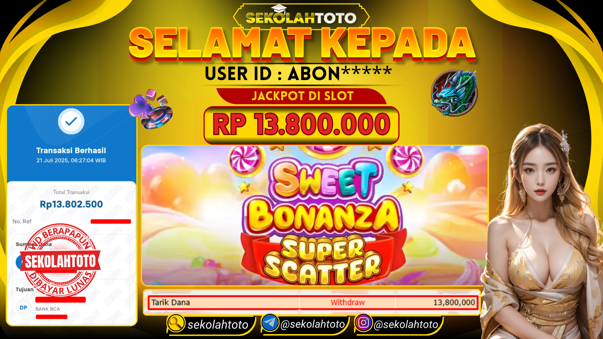 BUKTI PEMBAYARAN JACKPOT PRAGMATIC PLAY 21 Juli 2025 Posted by kepsektoto SWEET BONANZA SUPER SCATER SENIN , 21 JULI 2025 RP 13,800,000,- Selamat Kepada Pemenang. Salam JP Updated: 21 Juli 2025 at 08:37 ◀ Prediksi Togel Toto Macau Hari Ini Prediksi Togel Bullseye Pools Hari Ini ▶