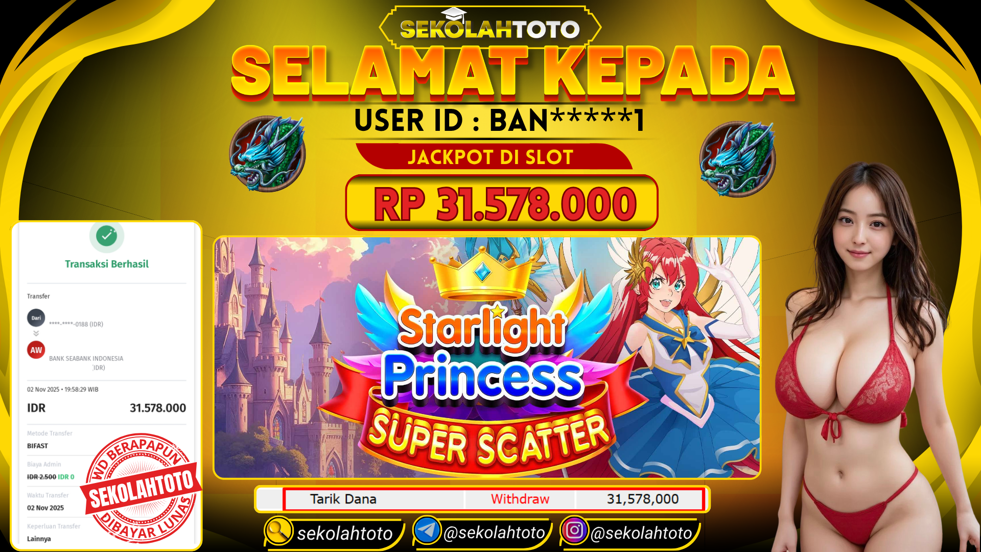 BUKTI PEMBAYARAN JACKPOT PRAGMATIC PLAY 2 November 2025 Posted by kepsektoto STARLIGHT PRINCESS SUPER SCATTER MINGGU, 2 NOVEMBER 2025 RP 31,578,000,- Selamat Kepada Pemenang. Salam JP Updated: 2 November 2025 at 20:06 ◀ BUKTI PEMBAYARAN JACKPOT PRAGMATIC PLAY Prediksi Togel Bullseye Pools Hari Ini ▶