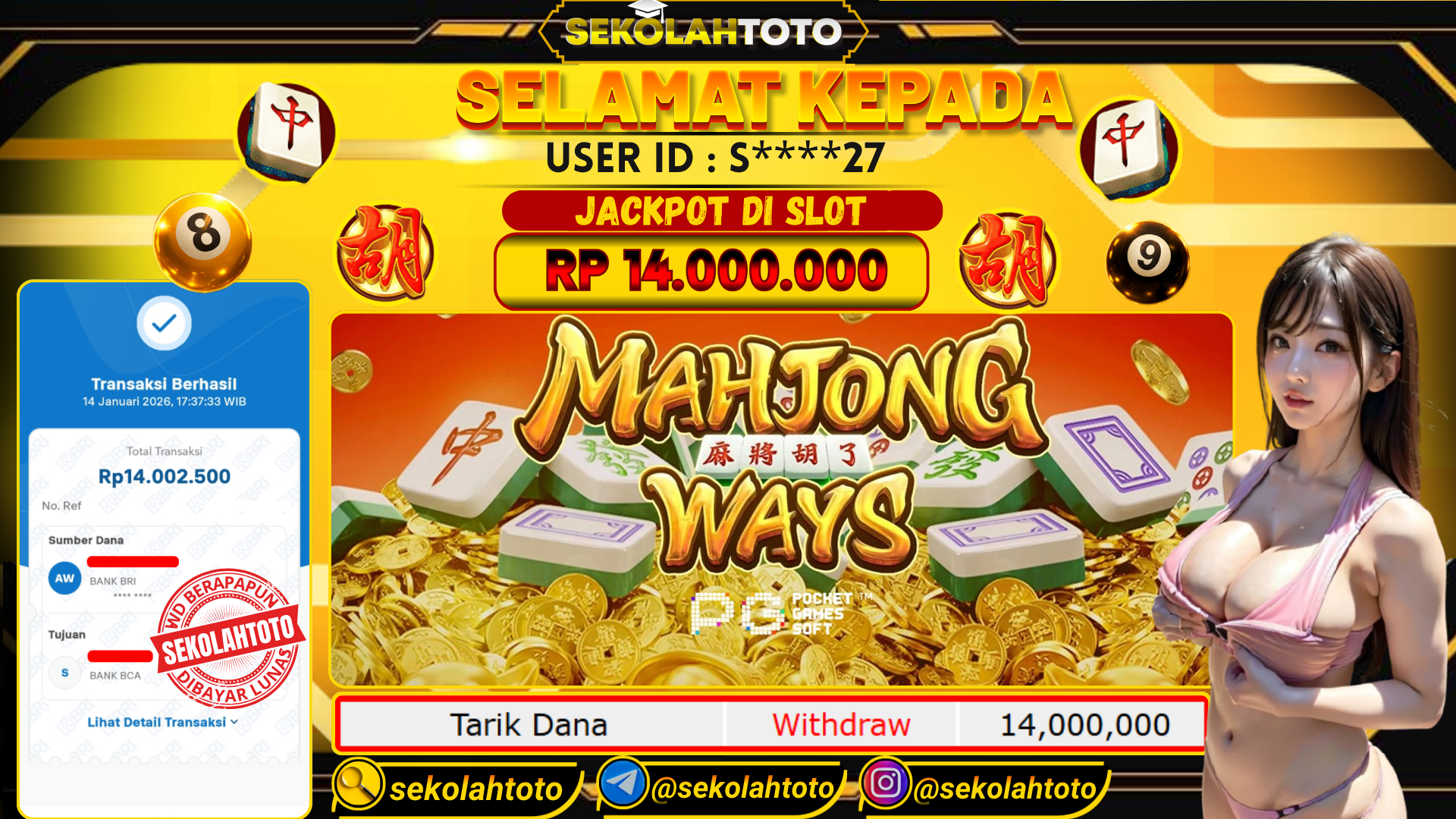 BUKTI PEMBAYARAN JACKPOT PG SOFT 14 Januari 2026 Posted by kepsektoto MAHJONG WAYS RABU, 14 JANUARI 2026 RP 14,000,000,- Selamat Kepada Pemenang. Salam JP Updated: 14 Januari 2026 at 18:14 ◀ BUKTI PEMBAYARAN JACKPOT TOGEL Prediksi Togel Bullseye Pools Hari Ini ▶